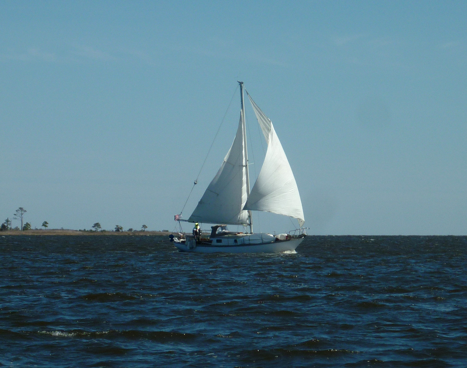 With the wind still blowing hard and cold in the morning, even Dan wasn't off at the crack of dawn, and we both pulled anchor and sailed out together around 10:30 am. We didn't have far to go, just Oriental, where we planned to get on the town dock for the night and attend the open mike night at the Silos. With the wind out of the northeast to east at 10 to 12 knots, we made good time up the river. It was a real pleasure to sail in company with Marian Claire and watch that beautiful boat surf down the swell rolling in from the sound.