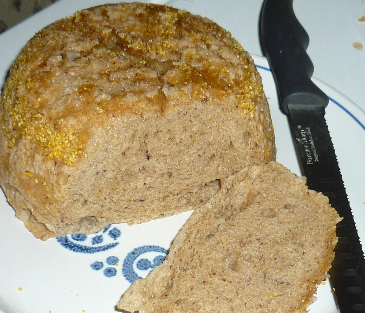 I was lucky to have a pyrex mixing bowl that just fit inside my pressure cooker, so I let the dough rise in it. The dough filled the bowl and domed up to the extent that I knew it wasn't going to fit in the cooker, so I cut off a bit and used it to make fried dough, something I learned to eat when Marie and I visited Maine some years ago. I beat the remaining dough down and set it back in the bowl for a second rising (I oiled the bowl and dusted it with coarse ground corn meal). Once the dough came back up, I put the steaming pan in the bottom of the cooker, added water just up to the pan, and put the pyrex bowl with the risen dough in the cooker. Then, with the lid and regulator in place, I brought up pressure. I didn't get it screaming like a banshee, and I didn't leave it barely seeping steam, I brought it to a good middling stage with the regulator rocking. I cooked it this way for 20 minutes and then took it off the heat and let the pressure come down on its own. Then I got the bowl of bread out and let it cool like I would a batter bread. Once cool, I ran a knife around the edges and the bread came out with no problem.
