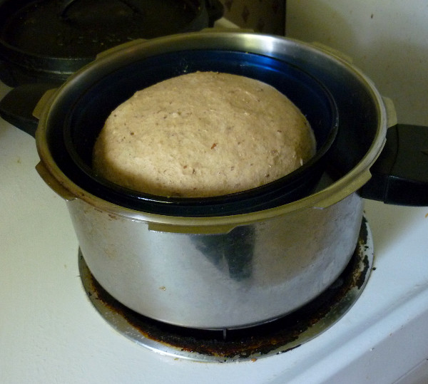 The real test will come aboard Valor at some anchorage along the river, but I have every reason to believe that this pressure cooker bread will work very well on my propane stove. The water and steam temper the stove's heat and prevent scorching. I've cooked everything from beans to potatoes to whole chickens in the pressure cooker aboard Valor, and bread from a twice-tested recipe should be a snap.