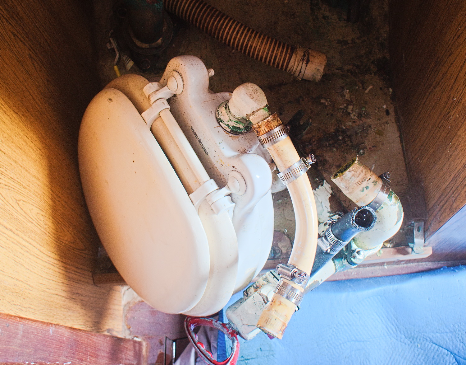 I am quite satisfied with my composting head installation. On a recent visit to the boatyard, I had the two now-extraneous through-hulls glassed over, which allowed me to drop the platform by several inches. A few things remain to be done. The tank for the old retention setup can be removed to free up storage space. It's a shame that I will probably have to cut up this perfectly good tank to get it out of the locker. Pearson evidently installed it before the cabinetry in the forepeak was finished, and it won't come out in one piece. The wiring for the chemical treatment apparatus can also be removed. Yes, Terry Ann was built in 1964 with a primitive chemical head. The Whale Gusher that once moved seawater and sewage can be removed, rebuilt and put into stores.