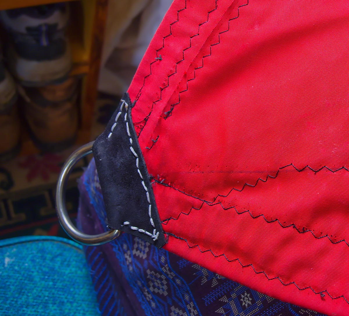 Once the two webbing straps that hold the d-ring in place were sewed in, it was time to do some hand stitching. I punched a row of holes along the d-ring bar with an awl and then used doubled heavy whipping twine to frap the bar onto the edge of the sail. With that done, I was able to turn down the sacrificial cloth and stitch it back in place. To protect the stitching from chafe I finished off with a leather butterfly patch over the d-ring bar.