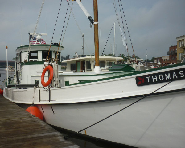 Walking back along the dock I stopped to chat with Tom Leath aboard his 36 foot American Marine trawler "Managing". American Marine started the trawler revolution with their Grand Banks line in 1965. These gorgeous boats were built to the highest standards in Hong Kong and Singapore, and over 1,400 wooden hulls were built before production ceased in 1973. American Marine eventually became Grand Banks Yachts and still builds trawlers, though in fiberglass. Tom invited me aboard and I demurred, seeing as I was wearing tennis shoes, but he graciously waived the "deck shoes only" regulation and so I got to see the interior of this beautiful boat. We spent a few moments discussing twin diesels and generators under the salon floor, the benefits of a relatively shallow draft, and the range made possible by big fuel tanks and an easily driven hull. Afterward I exited by the aft hatch and came across Tom's partner Cathy Christman. I asked if she was the managing partner and she smiled and nodded. Tom and Cathy's website detailing their arduous restoration and adventurous voyages can be found at Grand Banks website.